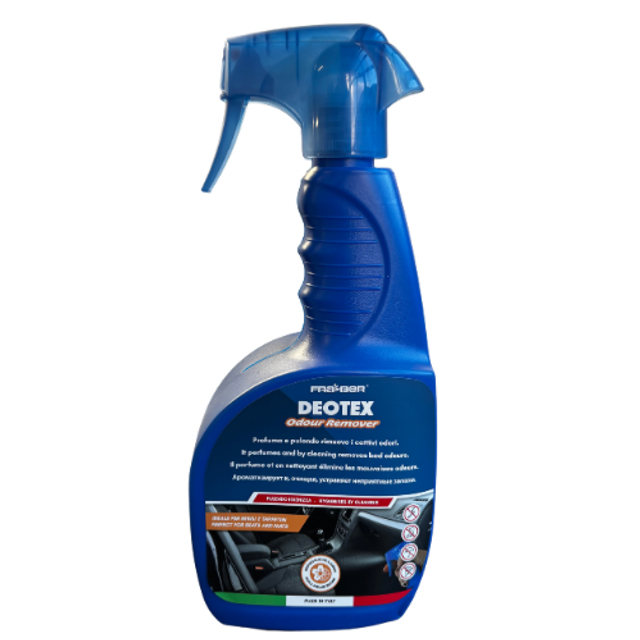 Fra-Ber’s Deotex nettoie, capture, élimine et supprime les odeurs* des intérieurs de voiture tout en laissant un agréable parfum de musc et d’agrumes.