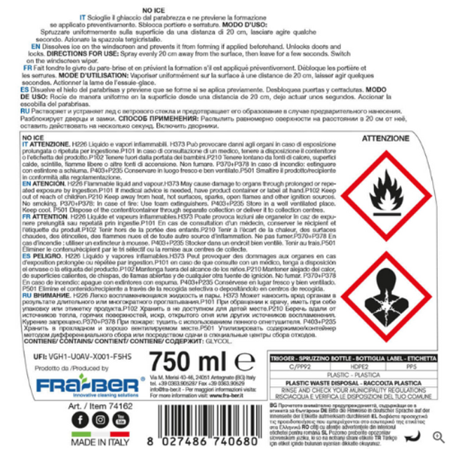 No Ice by Fra-Ber est un spray dégivrant, anti-givre et dégelant pour automobiles, conçu pour éliminer rapidement le givre et la glace sur les véhicules.